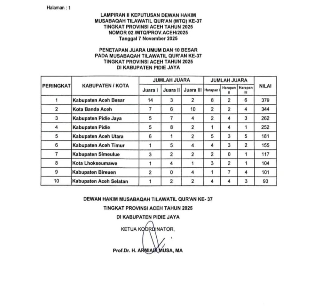Dalam penutupan tersebut, dewan hakim yang diketuai Prof. Dr. H. Armiadi Musa, MA secara resmi mengumumkan hasil penilaian akhir dan penetapan 10 besar kafilah terbaik MTQ ke-37 Provinsi Aceh Tahun 2025.