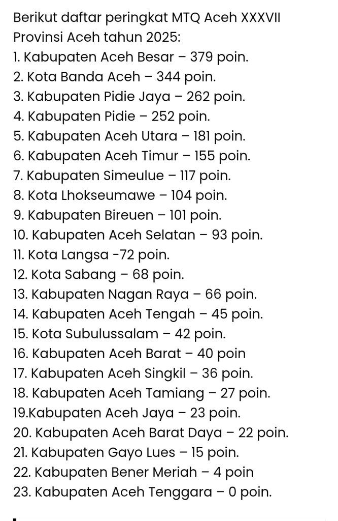 ISUPUBLIK.ID – Kabupaten Aceh Jaya harus puas berada di posisi ke-19 dari 23 kabupaten/kota se-Aceh dalam ajang Musabaqah Tilawatil Qur’an (MTQ) ke-37 tingkat Provinsi Aceh tahun 2025. Dari hasil resmi yang dirilis panitia, Aceh Jaya hanya mengumpulkan 23 poin.