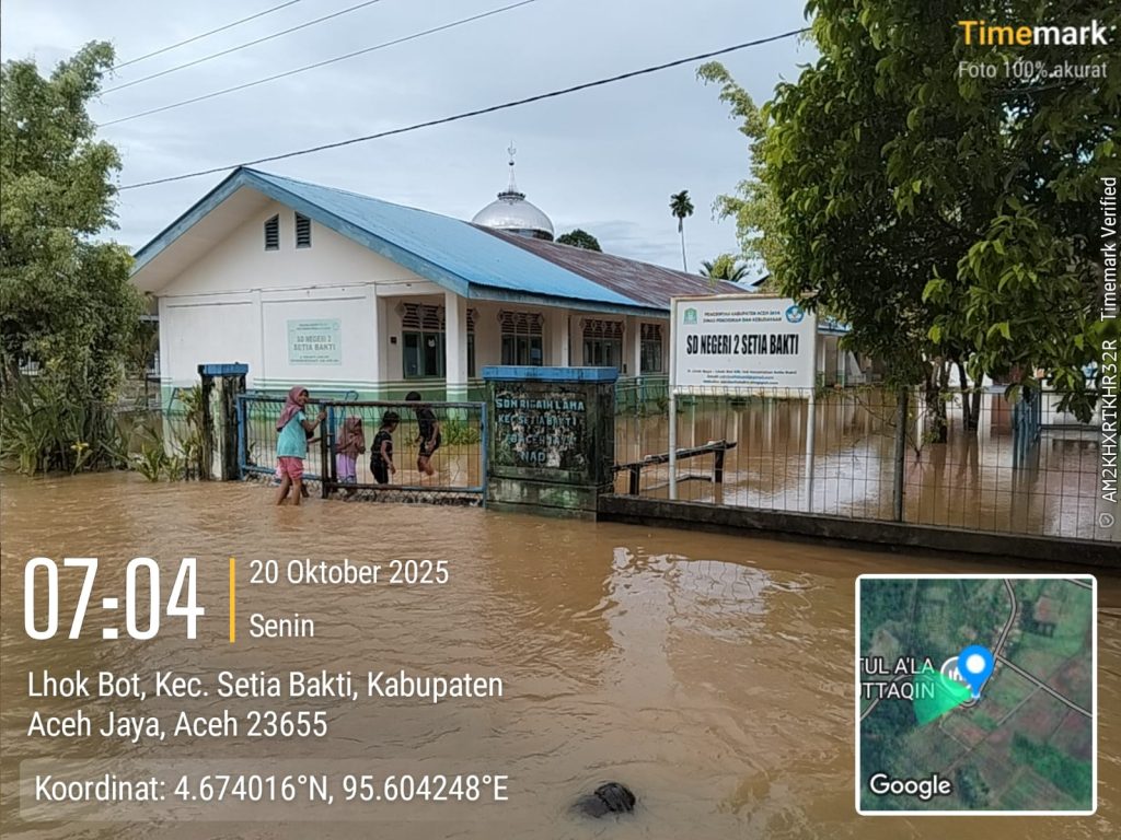 ISUPUBLIK.ID – Curah hujan tinggi yang mengguyur wilayah Kabupaten Aceh Jaya sejak dua hari terakhir mulai menimbulkan dampak serius di sejumlah titik. Salah satu daerah yang terdampak cukup parah adalah Desa Lhok Bot, Kecamatan Setia Bakti, di mana satu Sekolah Dasar (SD) terpaksa meliburkan seluruh siswanya akibat genangan banjir yang memasuki area sekolah.