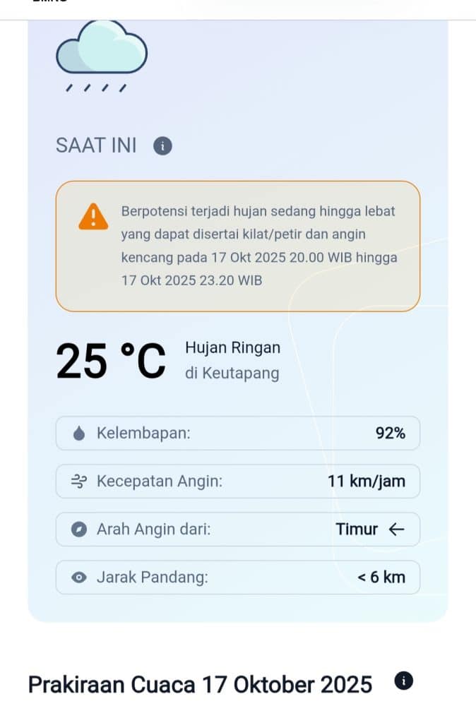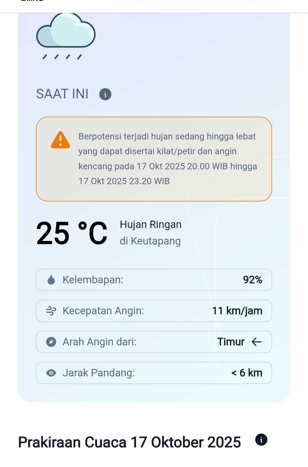 “Cuaca dengan intensitas sedang hingga lebat berpotensi terjadi di beberapa wilayah pesisir Aceh bagian barat. Kami imbau masyarakat untuk tetap memantau perkembangan informasi cuaca melalui kanal resmi BMKG,” demikian pernyataan tertulis dari lembaga tersebut.