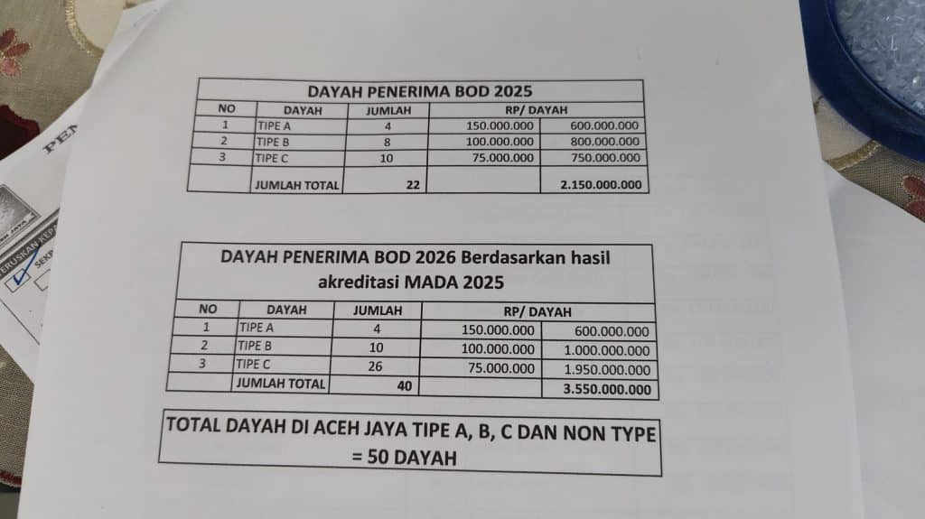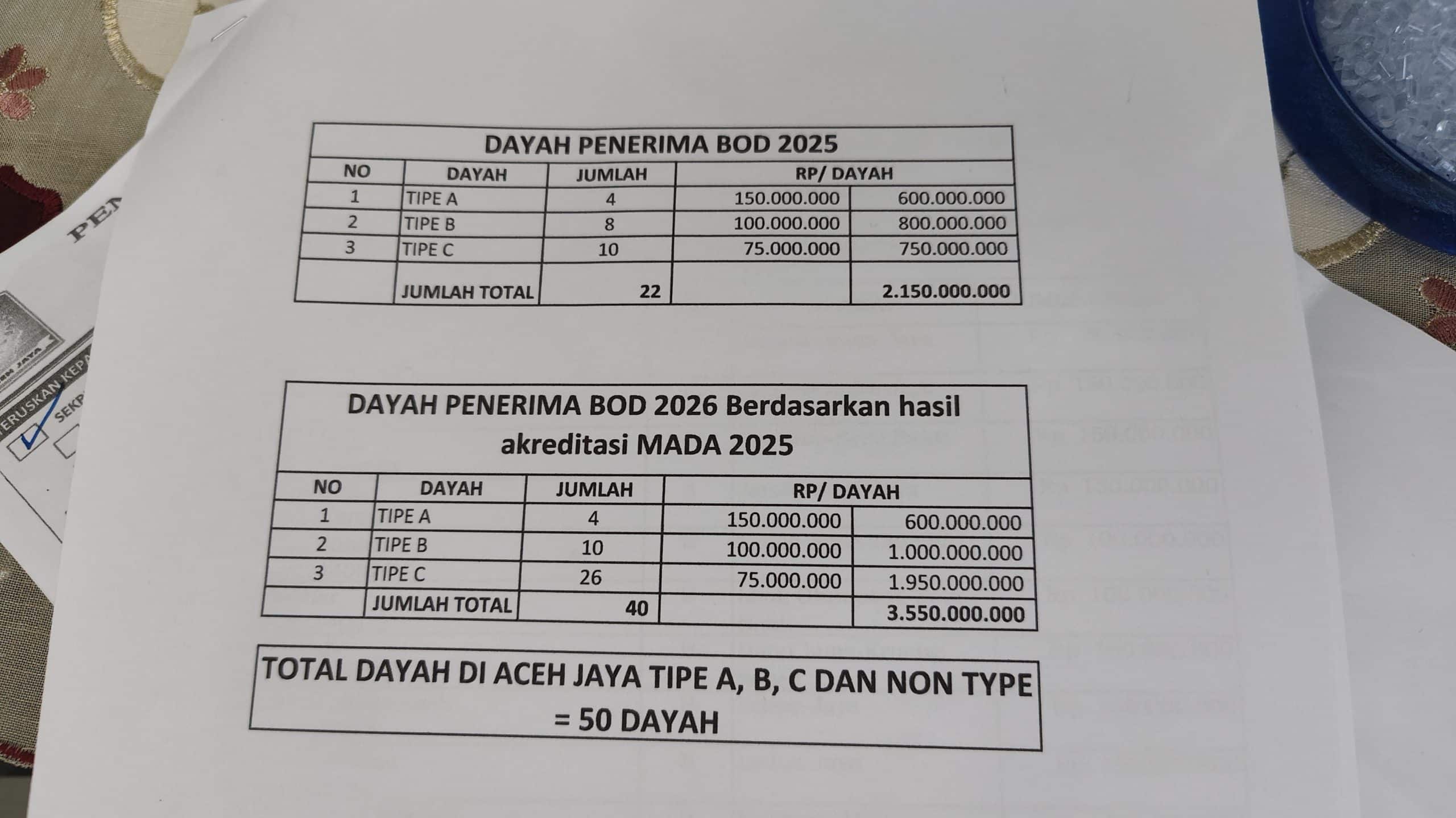 Ia menjelaskan, berdasarkan hasil akreditasi Majelis Akreditasi Dayah (MADA) tahun 2025, jumlah penerima BOD pada 2026 diproyeksikan meningkat menjadi 40 dayah dengan total anggaran sekitar Rp3,55 miliar.