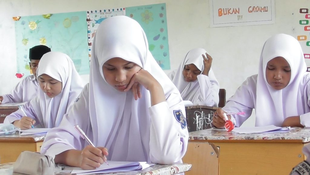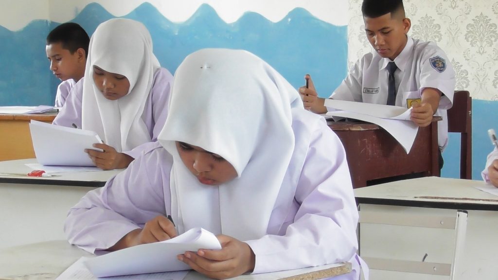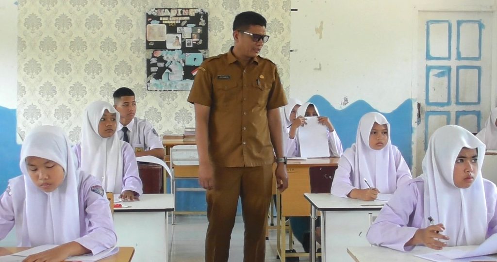 Siswa tingkat SMP sederajat sedang mengikuti seleksi beasiswa berprestasi di SMP Negeri 1 Krueng Sabee, Kabupaten Aceh Jaya.(foto-Isupublik.id)