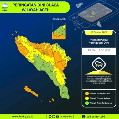 Peristiwa Peristiwa BMKG Keluarkan Peringatan Dini Hujan Lebat di Aceh Jaya Sore Ini 19/10/2025 • 83 Dilihat • ISUPUBLIK.ID – Badan Meteorologi, Klimatologi, dan Geofisika (BMKG) Aceh mengeluarkan peringatan dini cuaca ekstrem untuk...